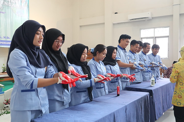 Pada pelatihan ini peserta dibekali materi mengenai Personal Hygiene, yang mencakup kebersihan tangan, rambut, kuku, hingga pakaian. Salah satu poin utama yang disorot adalah praktik mencuci tangan (hand hygiene) dengan benar menggunakan 6 langkah sesuai standar WHO. Peserta tidak hanya mendengarkan paparan dari narasumber, tetapi juga langsung mempraktikannya dalam sesi simulasi. Materi - materi yang diberikan sangat penting untuk menumbuhkan kesadaran peserta bahwa infeksi dapat dicegah sejak dini melalui kebiasaan sehari hari.
